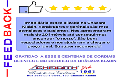 - "Não troco de imobiliária no Klabin. Cheidith é a minha escolha para a vida toda." — ⭐ ⭐ ⭐ ⭐ ⭐ (Site)
